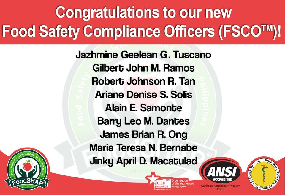 Congratulations to our new Food Safety Compliance Officers (FSCO™). #FoodSafetyComplianceOfficer is now a legal requirement under #FoodSafetyActIRR.