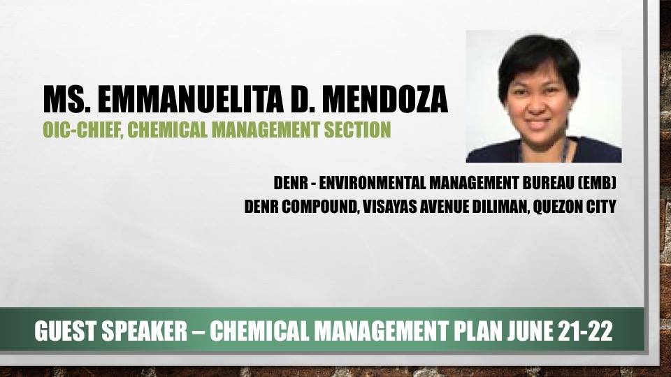 Meet our guest speaker for the CHEMICAL MANAGEMENT PLAN SEMINAR-WORKSHOP on June 21-22. REGISTRATION IS STILL OPEN. Call or text Ms. Eunice Bartolome at