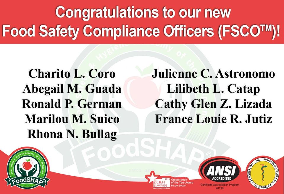Congratulations to our new Food Safety Compliance Officers (FSCO™). #FoodSafetyComplianceOfficer is now a legal requirement under #FoodSafetyActIRR.