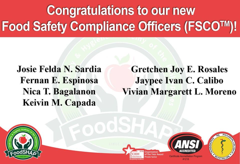 Congratulations to our new Food Safety Compliance Officers (FSCO™). #FoodSafetyComplianceOfficer is now a legal requirement under #FoodSafetyActIRR.