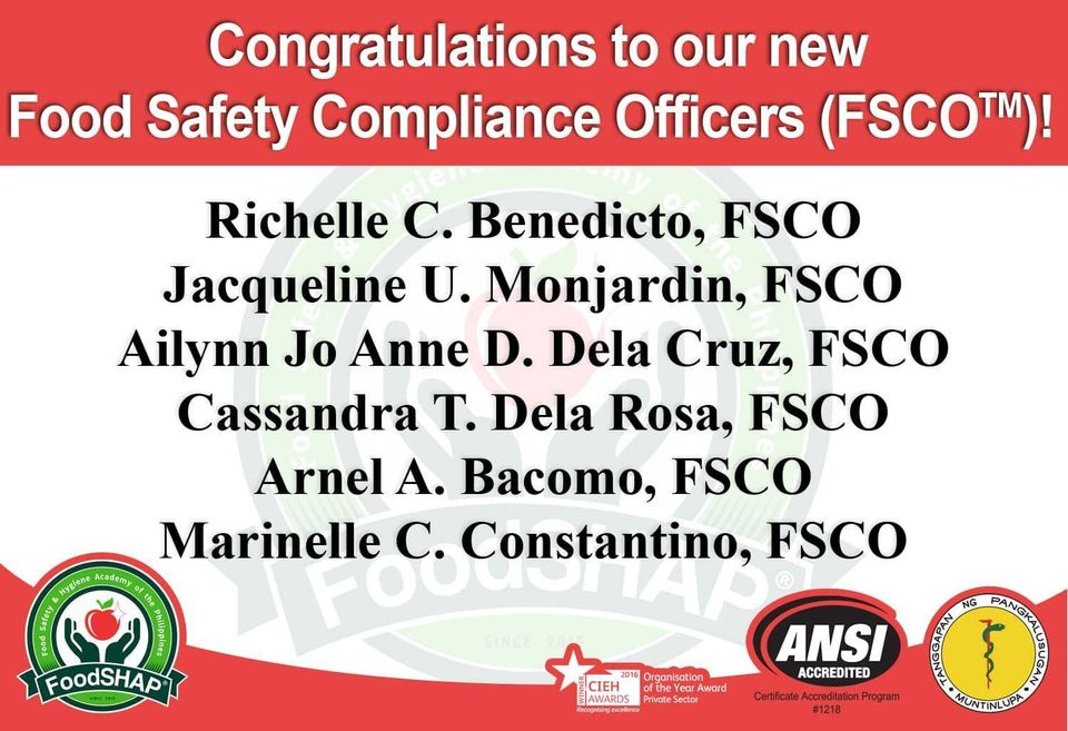 Congratulations to our new Food Safety Compliance Officers (FSCO™). #FoodSafetyComplianceOfficer is now a legal requirement under #FoodSafetyActIRR.