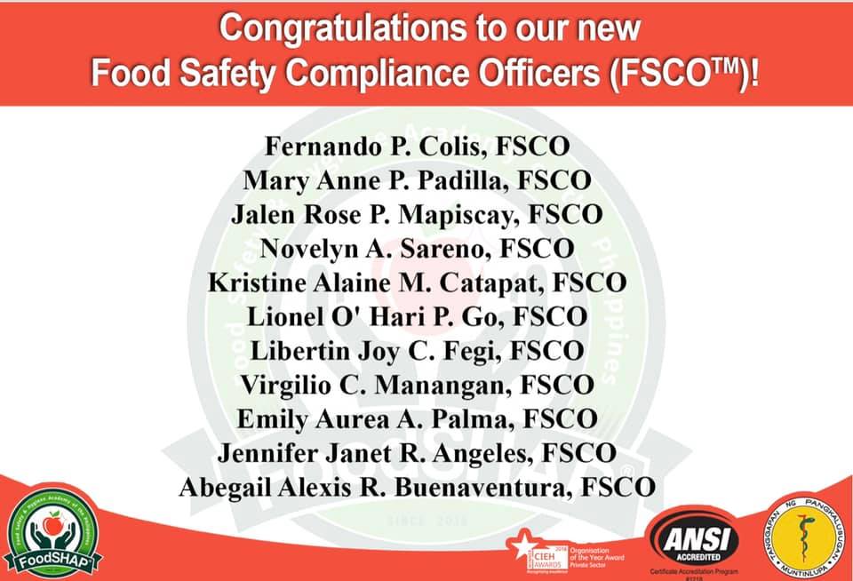 Congratulations to our new Food Safety Compliance Officers || FoodSHAP® is the first Food Safety Certificate program in Asia to be fully accredited by the American National Standards Institute (ANSI) and its certificates recognized in the USA and by the Philippines Department of Health (DOH) || Become FoodSHAP® Food Safety Compliance Officer, || visit www.foodshap.com.