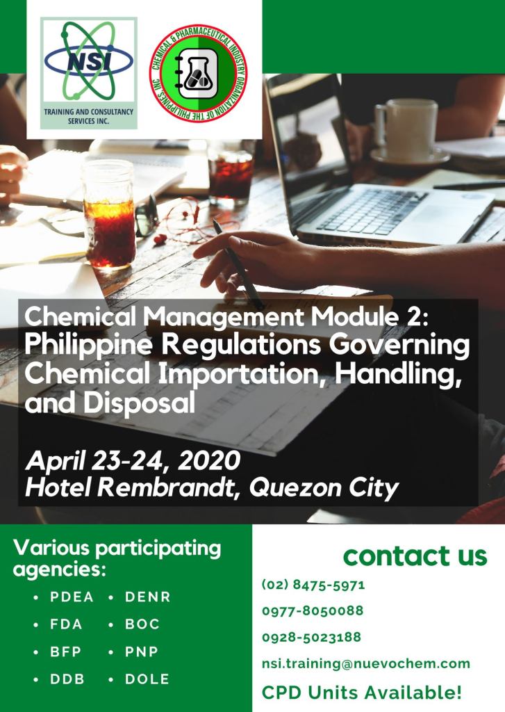 In partnership with the Chemical and Pharmaceutical Industry Organization of the Philippines, Inc., we’re inviting you to the Chemical Management Module 2: Philippine Regulations Governing Chemical Importation, Handling, and Disposal at Hotel Rembrandt, Quezon City this coming April 23-24, 2020.