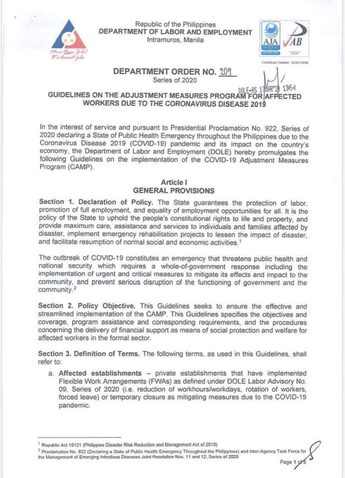 DOLE Department Order No. 209:Guidelines on the Adjustment Measures program for Affected Workers Due to the Coronavirus Disease 2019