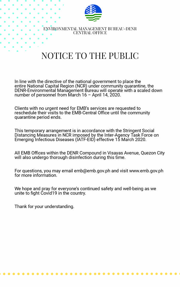 EMB-DENR Central Office will operate with a scaled down number of personnel from March 16 – April 14, 2020.