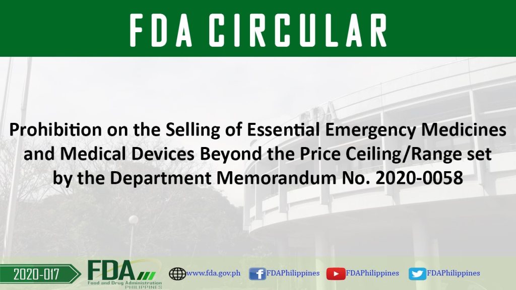 FDA Circular No. 2020-017 || Prohibition on the Selling of Essential Emergency Medicines and Medical Devices Beyond the Price Ceiling/Range set by the Department Memorandum No. 2020-0058