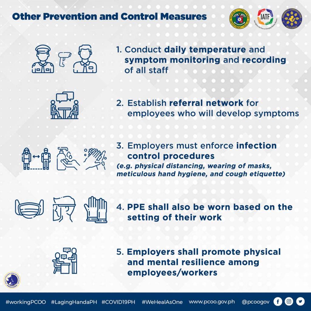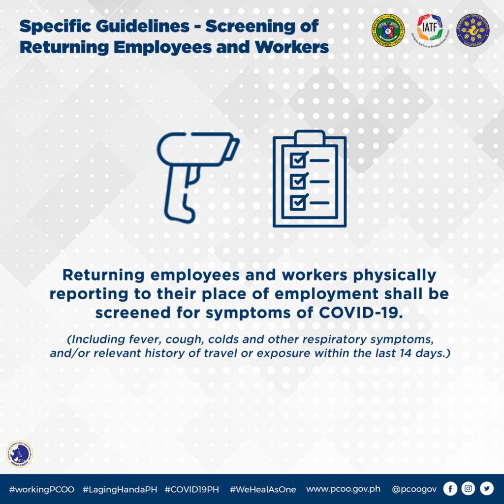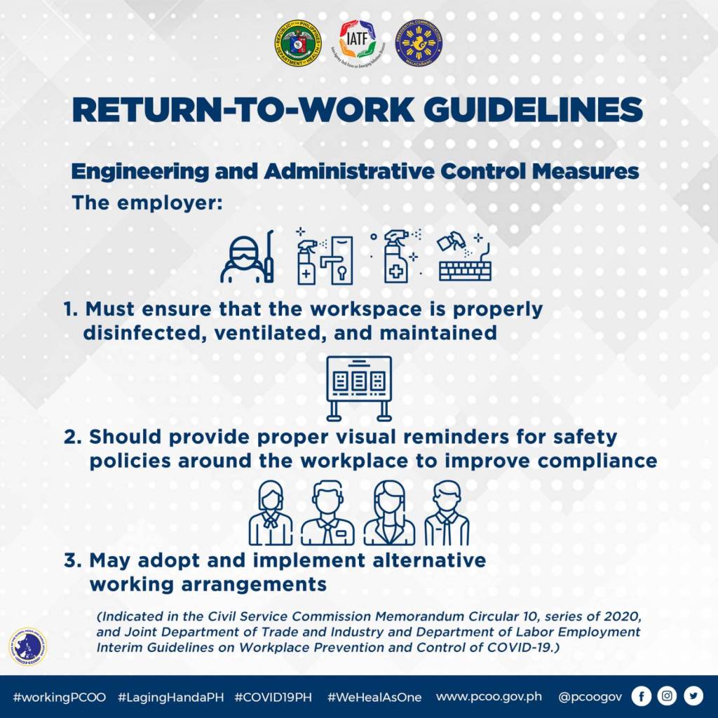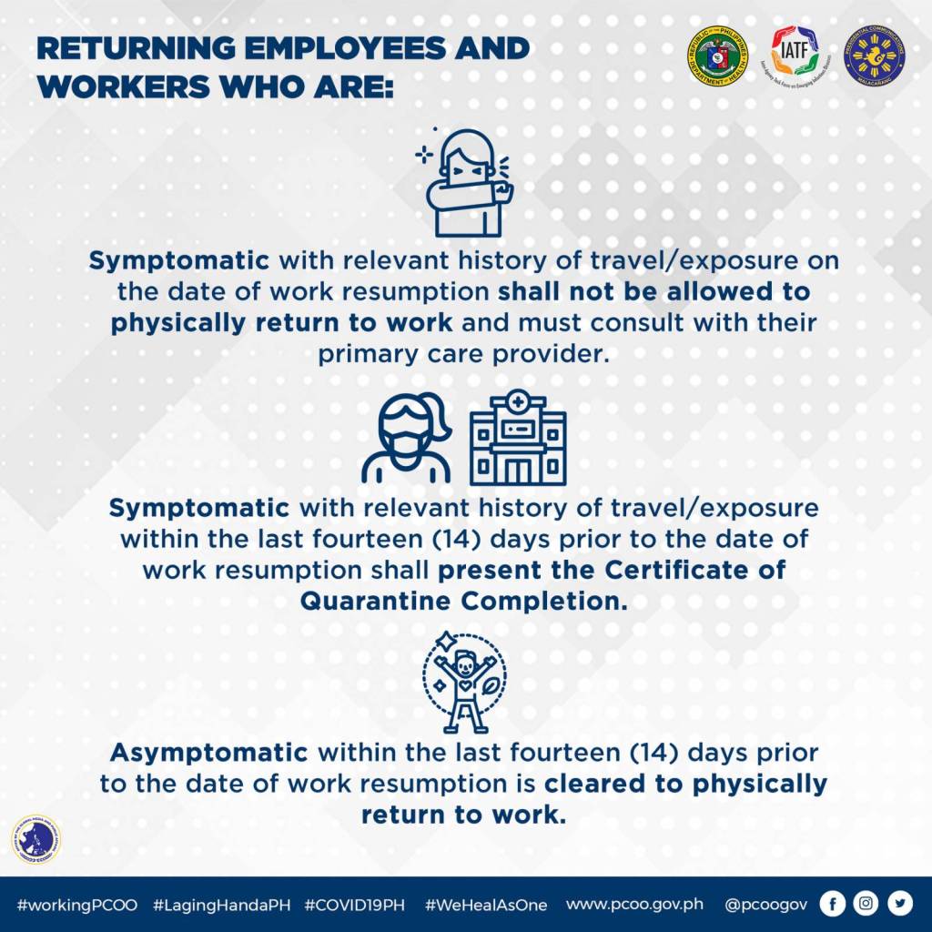 TINGNAN: Narito ang mga alituntunin para sa mga empleyado at employer na babalik sa trabaho sa mga lugar na ibinaba ang community quarantine classification base sa inilabas ng Department of Health.#LagingHandaPH#COVID19PH#workingPCOO#WeHealAsOne
