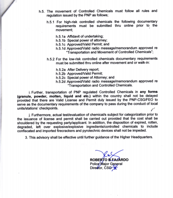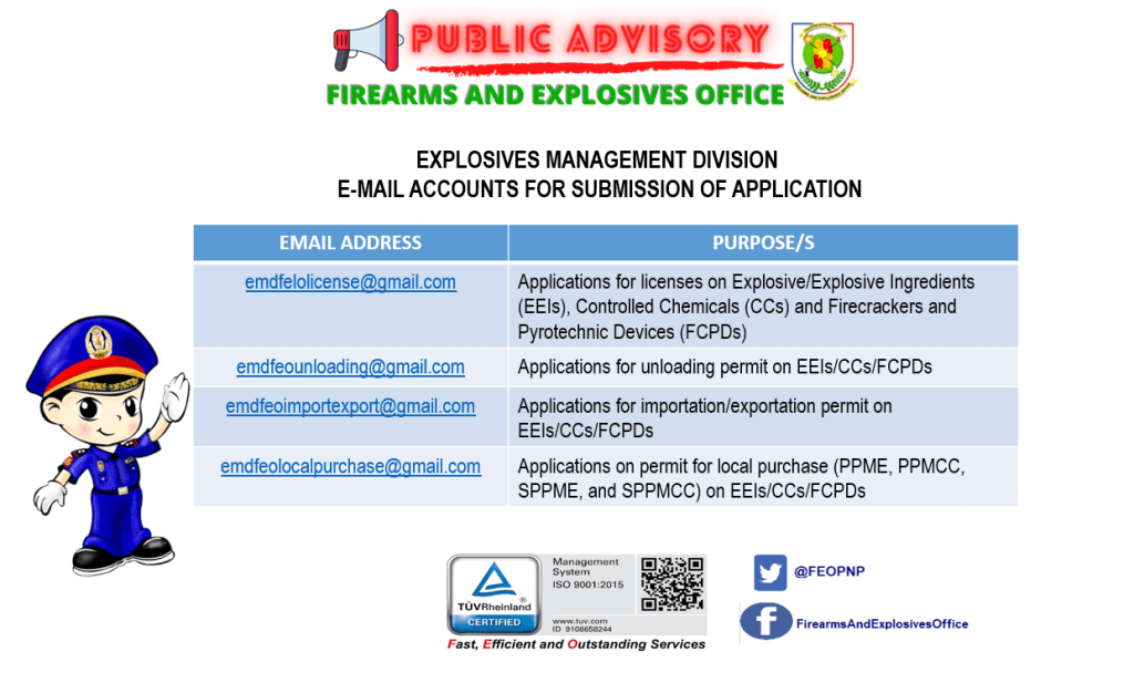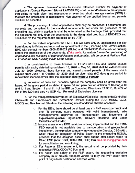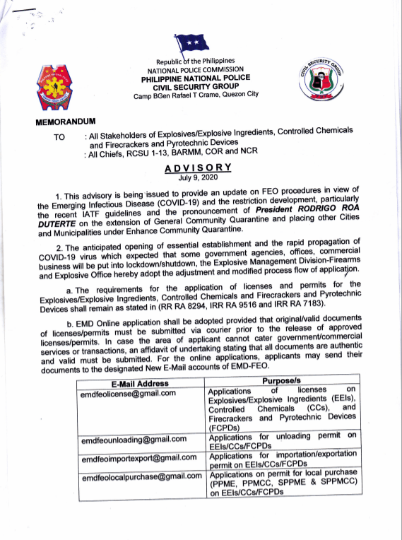 Per Director, CSG approved Memo July 9, 2020 under the supervision of PBGEN ROMMIL M MITRA, Chief, FEO, the following are the guidelines to be followed with regard to the submission of applications for Explosive, Explosive Ingredients, Controlled Chemicals, Firecrackers and Pyrotechnic Devices licenses and permits in line with the pronouncement of PRRD on the extension of General Community Quarantine (GCQ) and placing of municipalities and cities under Enhanced Community Quarantine (ECQ).