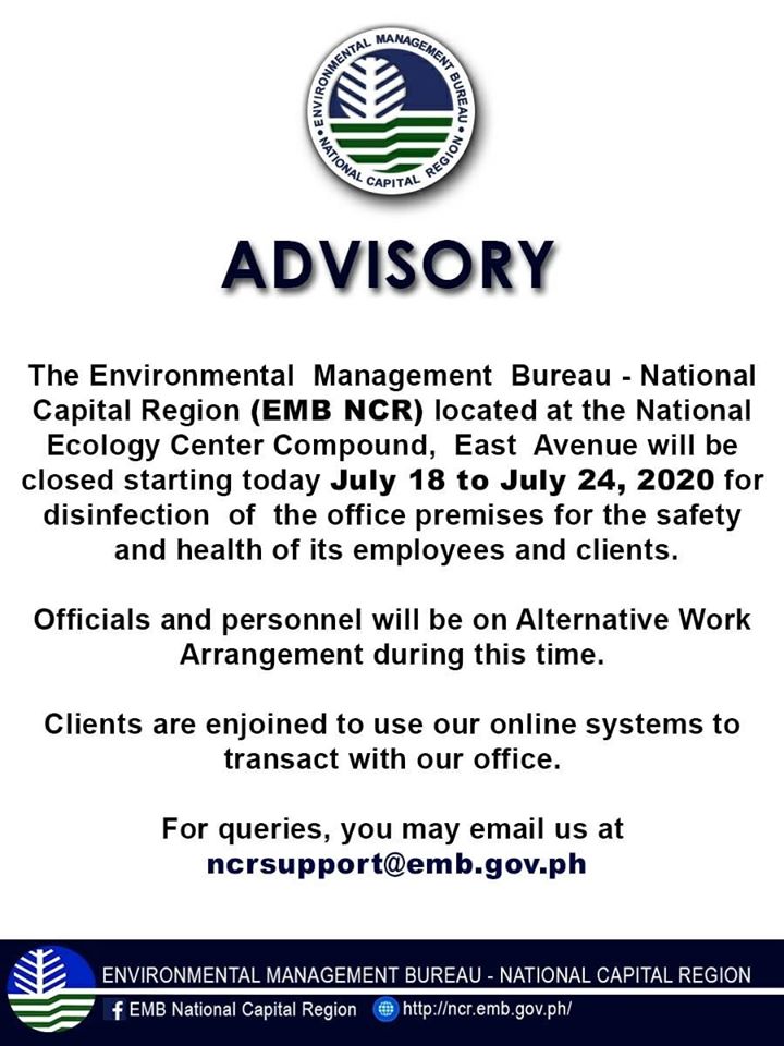 The Environmental Management Bureau – National Capital Region (EMB NCR) located at the National Ecology Center Compound, East Avenue will be closed starting today July 18 to July 24, 2020 for disinfection of the office premises for the safety and health of its employees and clients.