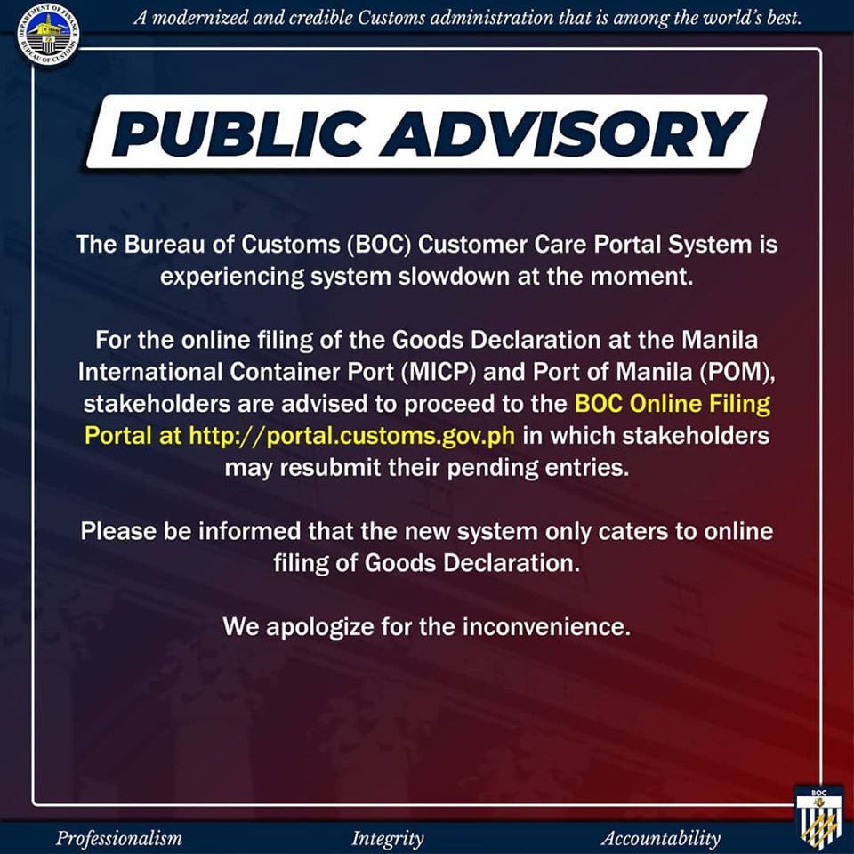 The Bureau of Customs (BOC) Customer Care Portal System is experiencing system slowdown at the moment.