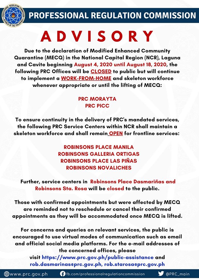Due to the declaration of Modified Enhanced Community Quarantine (MECQ) in the National Capital Region (NCR), Laguna and Cavite beginning August 4, 2020 until August 18, 2020, the following PRC Offices will be closed to public but will continue to implement a work-from-home and skeleton workforce whenever appropriate or until the lifting of MECQ: