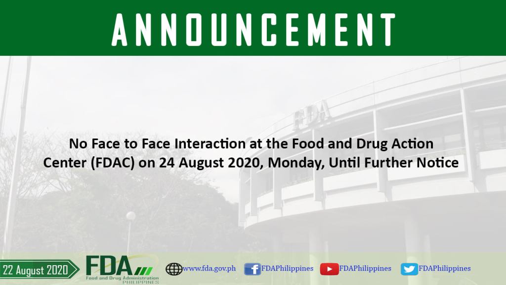No Face to Face Interaction at the Food and Drug Action Center (FDAC) on 24 August 2020, Monday, Until Further Notice