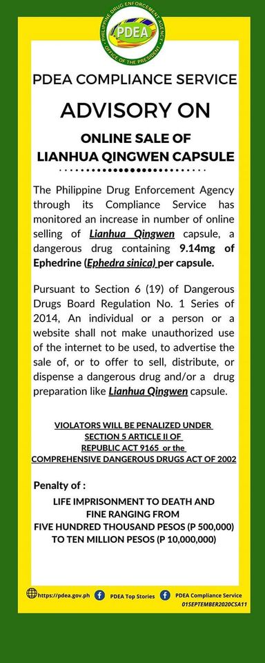 PDEA Advisory on Online Sale of Lianhua Qingwen Capsule