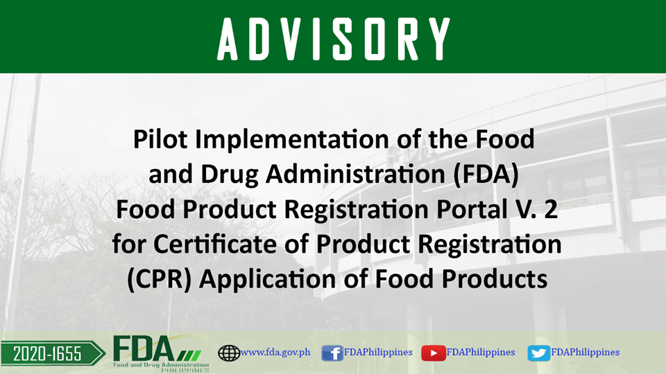 The FDA, with its aim to streamline submissions of’ all market authorization applications and to provide efficient public service, is currently enhancing the Electronic Portal tor FDA food product registration. This revised online platform shall be used in securing Certificate of Product Registration (CPR) and amended thereof The Food Product Registration Portal v.2 for CPU application is accessible to stakeholders for pilot testing (dry run) on 15 September 2020. Pilot testing or dry run is important to address glitches, loopholes, technical concerns or problems that may be encountered.