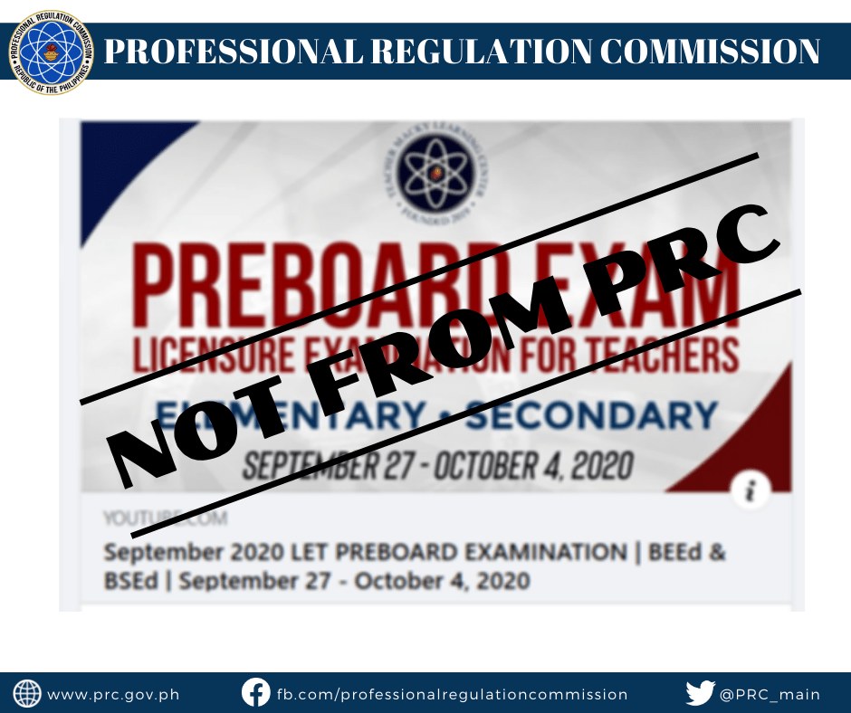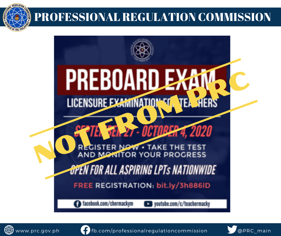 The Professional Regulation Commission (PRC) warns the public of the certain unofficial Facebook page with information on Pre-Board Examination for Professional Teachers currently circulating in social media that the same is not conducted by PRC nor is it connected to PRC in any way.