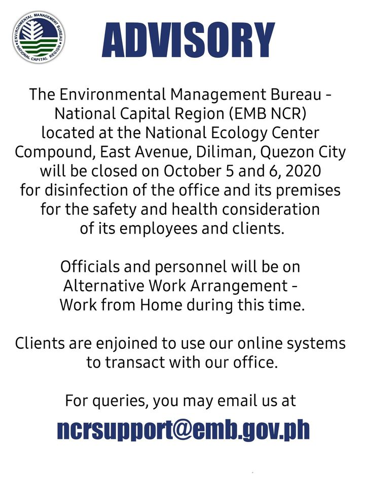 The Environmental Management Bureau – National Capital Region (EMB NCR) located at the National Ecology Center Compound, East Avenue, Diliman, Quezon City will be closed on October 5 and 6, 2020 for disinfection of the office and its premises for the safety and health consideration of its employees and clients.