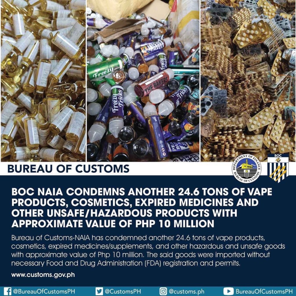 Bureau of Customs-NAIA has condemned another 24.6 tons of vape products, cosmetics, expired medicines/supplements, and other hazardous and unsafe goods with approximate value of Php 10 million. The said goods were imported without necessary Food and Drug Administration (FDA) registration and permits.