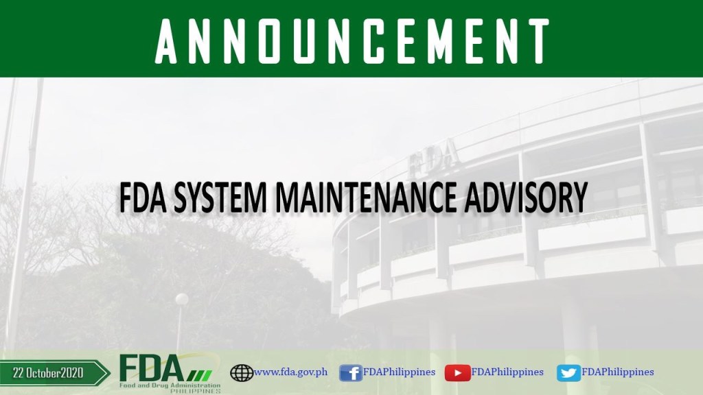The Food and Drug Administration (FDA) – Policy and Planning Service- Information and Communication Technology Management Division (PPS-ICTMD) will conduct a scheduled system maintenance on 23 October 2020 , 7:00 PM.