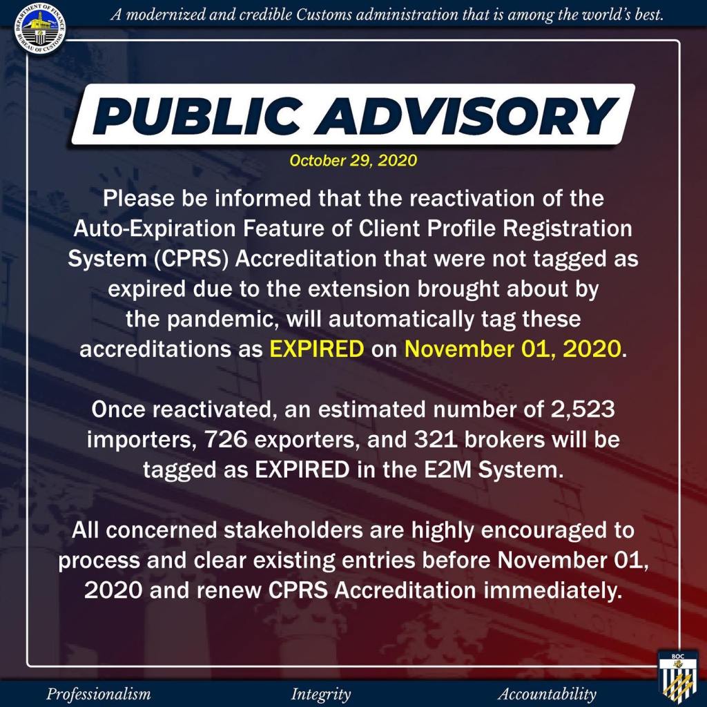 Please be informed that the reactivation of the Auto-Expiration Feature of Client Profile Registration System (CPRS) Accreditation that were not tagged as expired due to the extension brought about by the pandemic, will automatically tag these accreditations as EXPIRED on November 01, 2020.