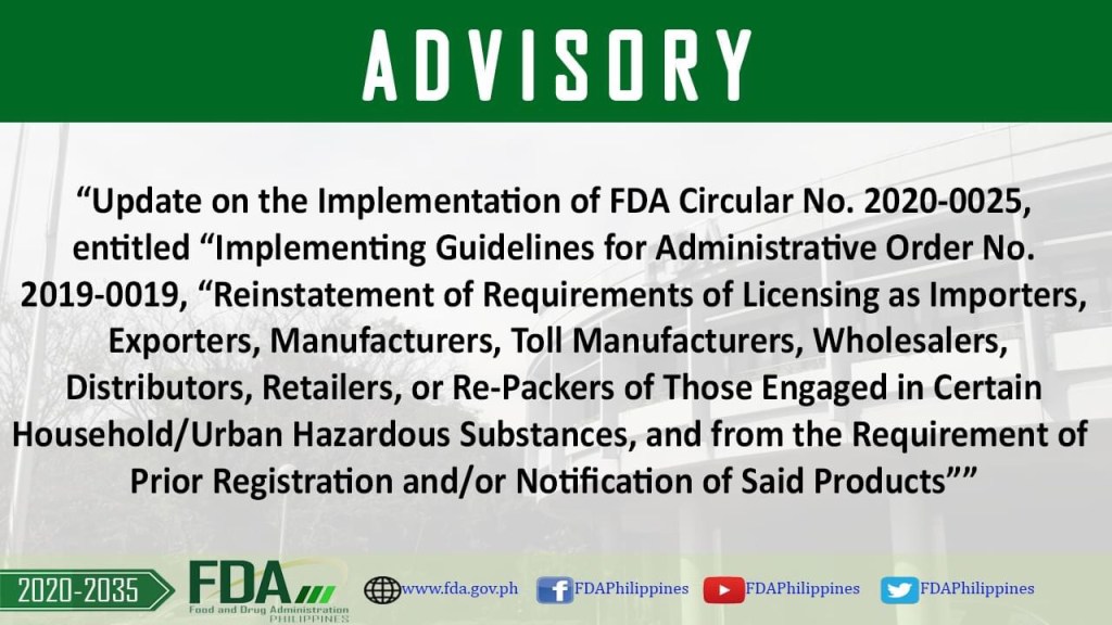 In view of the foregoing, all covered establishments are advised to comply with the provisions of FDA Circular No. 2020-0025, subject to the above implementation timelines, and to adhere to standards in ensuring the safety, quality and efficacy of all HUHS products at all times.