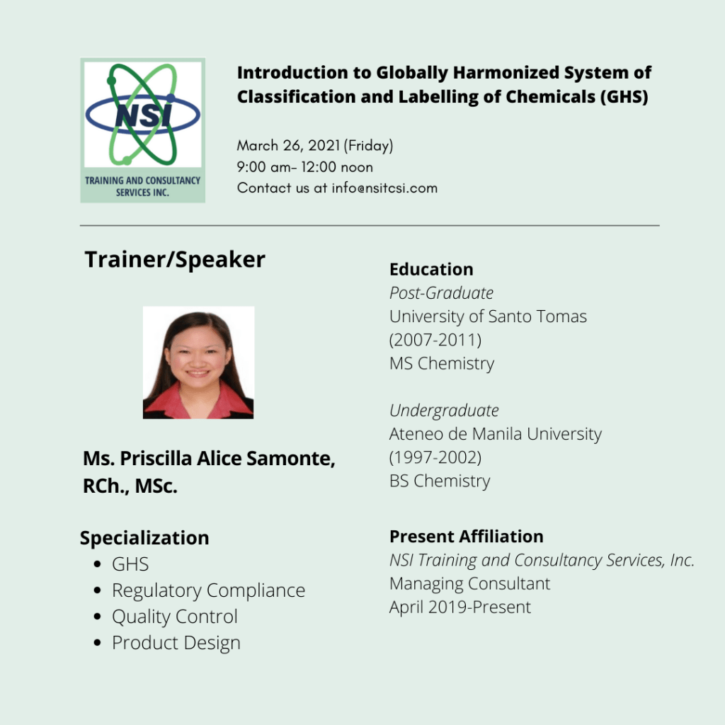 Meet our speaker for the webinar! Ms. Priscilla Alice “Mutya” Samonte has more than 19 years of experience in various industries –rubber, pharmaceutical, personal care, household chemicals, hazardous waste treatment, food industries, and industrial chemical industries. She has held varied positions, particularly in Formulations, Quality Control, Research and Development, and Regulatory Compliance. She is presently working as a Technical and Regulatory Consultant to various local and multinational FMCG companies. For interested participants, you may register using this link: https://forms.gle/XAow4uZREXz6q2Te8
