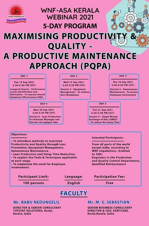 Alumni Society of AOTS Kerala, #India (ASA Kerala) is hosting the WNF ASA Kerala Training #Webinar “Maximizing #Productivity & Quality – Productive Maintenance Approach (PQPA)” under WNF (World Network of Friendship). It is a 5-day webinar program held on 14, 15, 16, 20 and 21, September 2021 for free of charge.