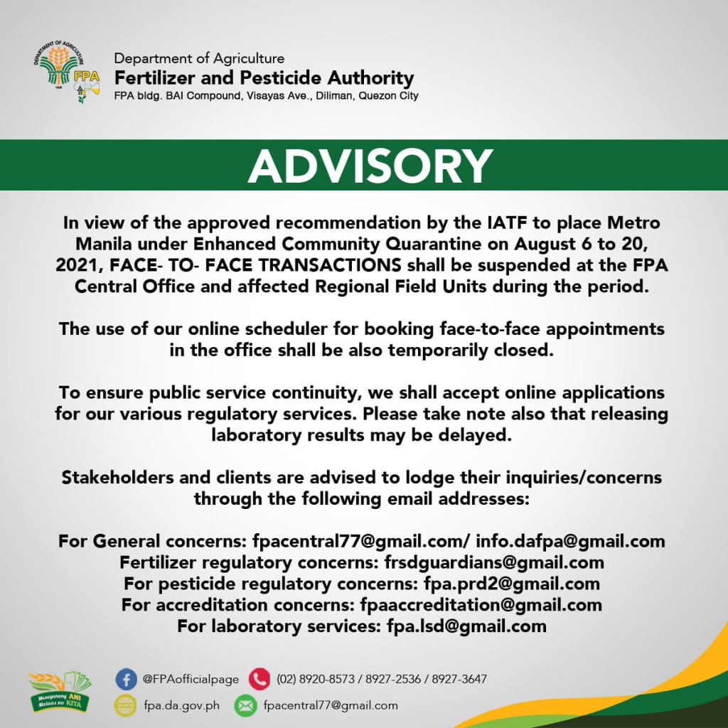 #ADVISORY: In view of the approved recommendation by the IATF to place Metro Manila under Enhanced Community Quarantine on August 6 to 20, 2021, FACE- TO- FACE TRANSACTIONS shall be suspended at the FPA Central Office and affected Regional Field Units during the period.