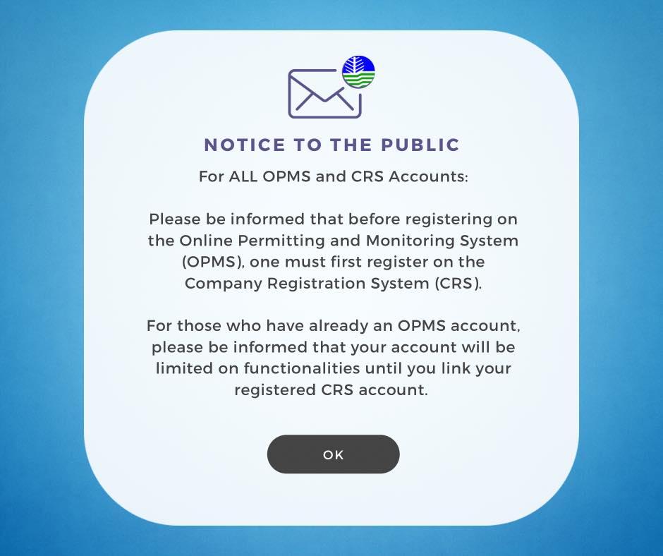 Please be informed that before registering on the Online Permitting and Monitoring System (OPMS), one must first register on the Company Registration System (CRS).