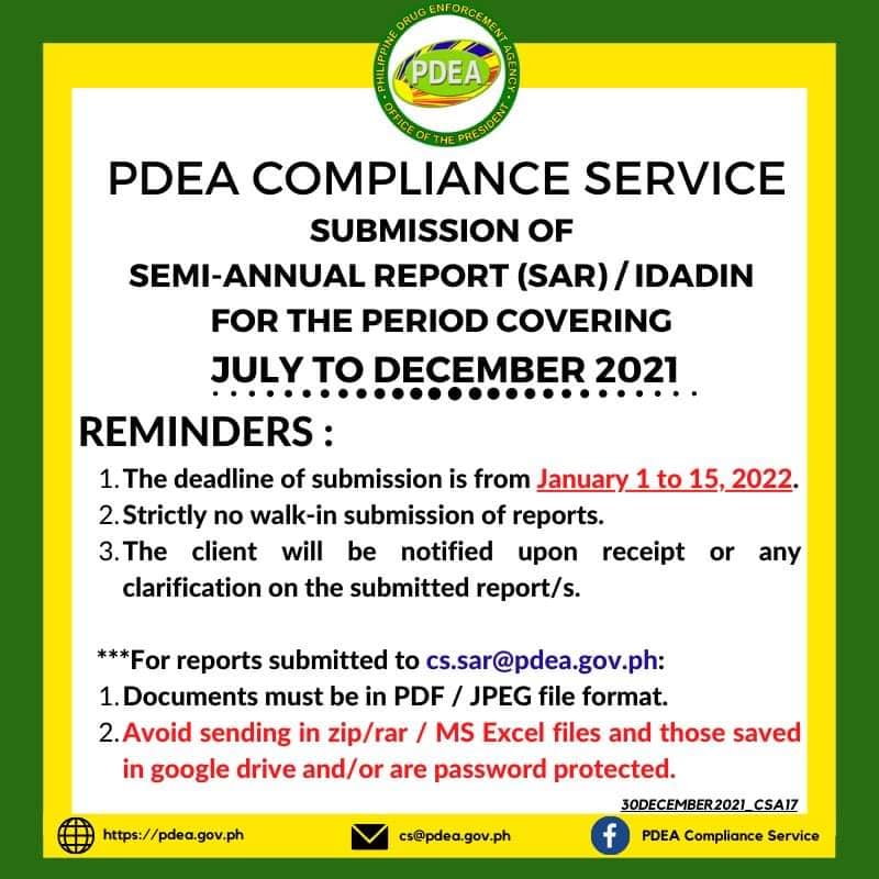 B. Entities handling MIXTURES CONTAINING CONTROLLED CHEMICALS are advised to email accomplished reports to cs.sar@pdea.gov.ph