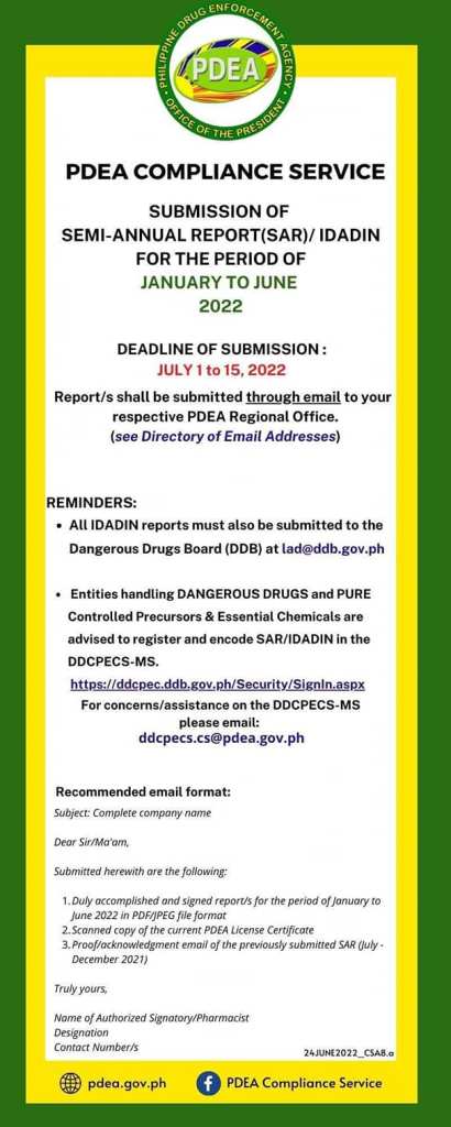 Submission of Semi-Annual Report (SAR) / IDADIN for the period of January to June 2022 is on July 1 to 15, 2022.