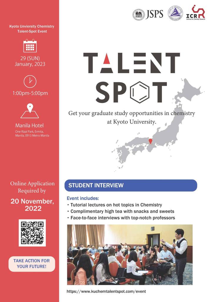 Calling all Chemistry undergrads and graduates! The Kyoto University Chemistry Talent-Spot event is coming to Manila bringing you featured talks on a multitude of chemistry topics, and networking opportunities to discuss graduate opportunities and more.