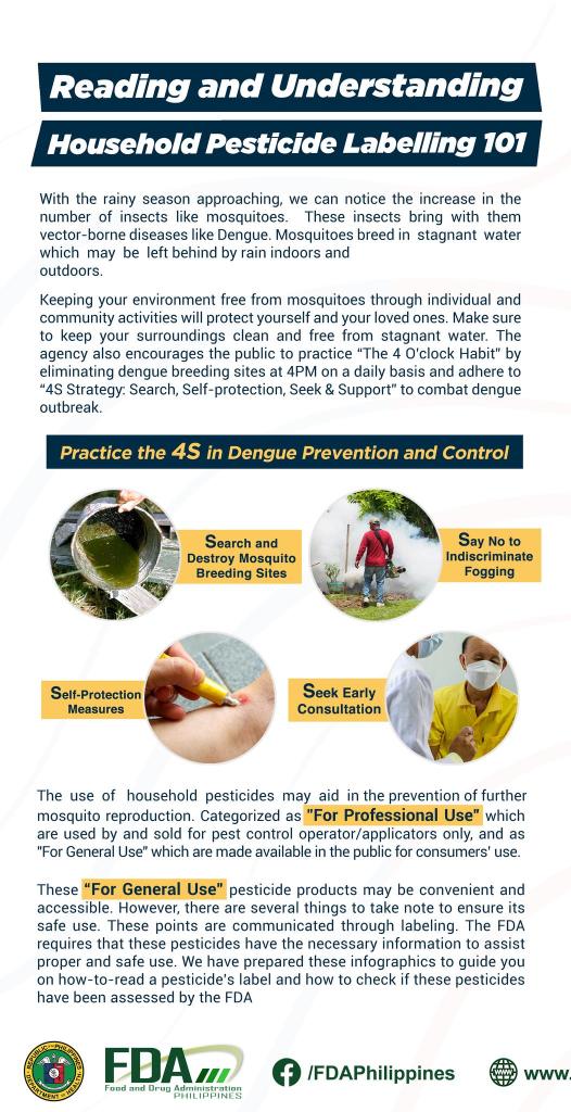 With the rainy season approaching, we can notice the increase of insects, like mosquitoes, in our surroundings. To protect yourself and your loved ones from the risk of Dengue, the FDA shares
