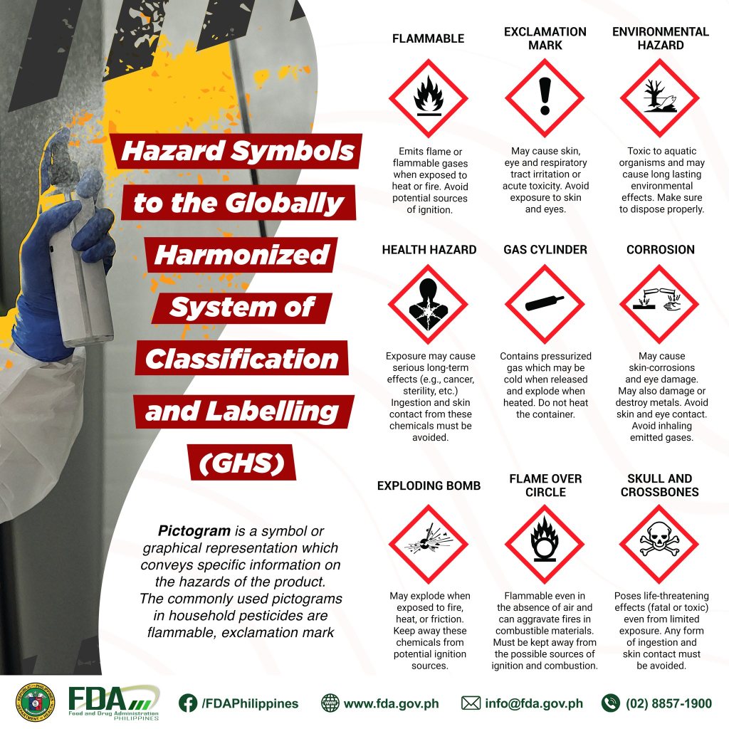 Pesticides bear pictograms to easily identify and understand the hazards they may present. This is done through the use of pictograms, which are symbols which convey messages without the use of words.