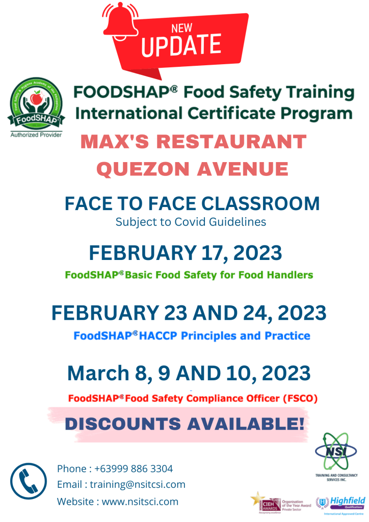 Due to popular demand, our FoodSHAP trainings are now moved to new dates. This is to accommodate more participants. Our venue is still at Max’s Restaurant Quezon Avenue Quezon City.