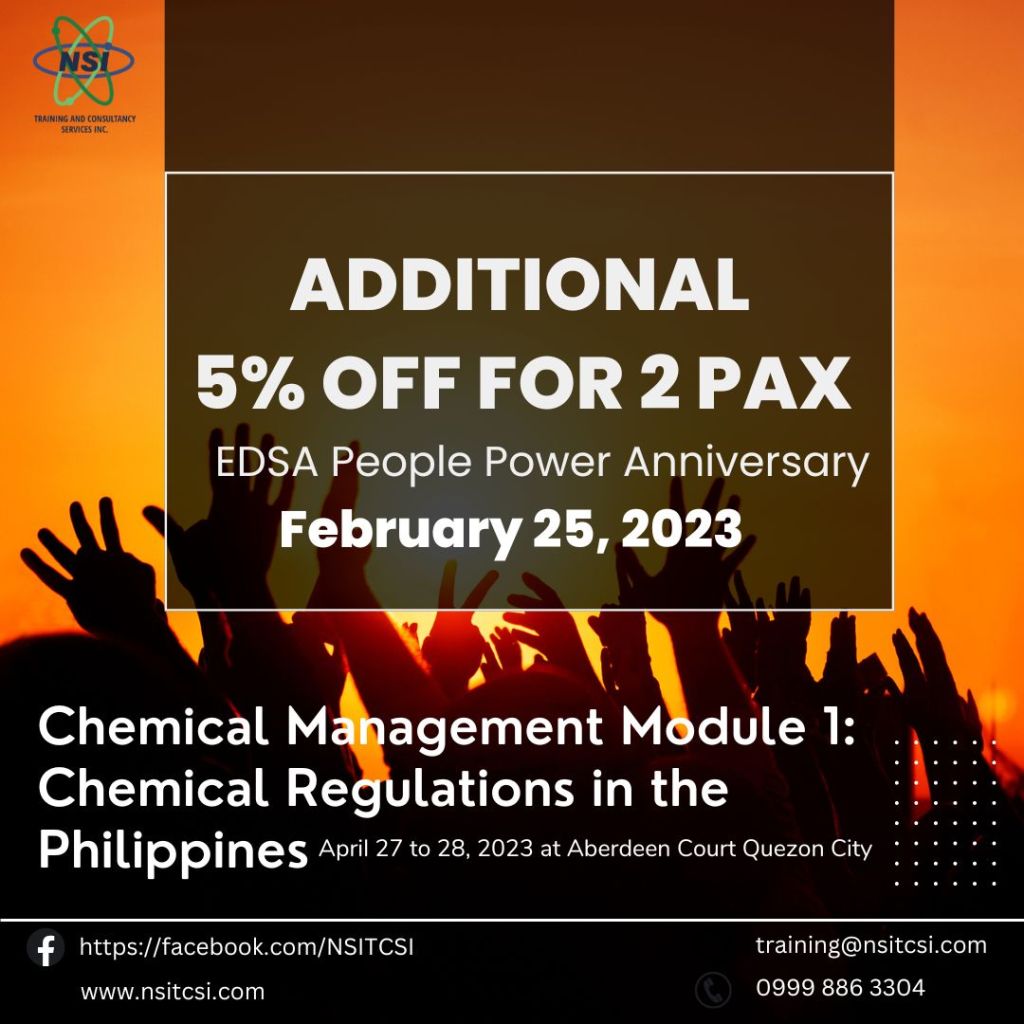 We will give 5% discount for every 2 participants signing up from the same company. This is on top of our EARLY BIRD RATE for our Chemical Management Module 1: Chemical Regulations in the Philippines. This will be held on April 27 to 28, 2023 from 8AM to 5PM at Aberdeen Court Quezon City. This promo is valid only today, February 25, 2023.