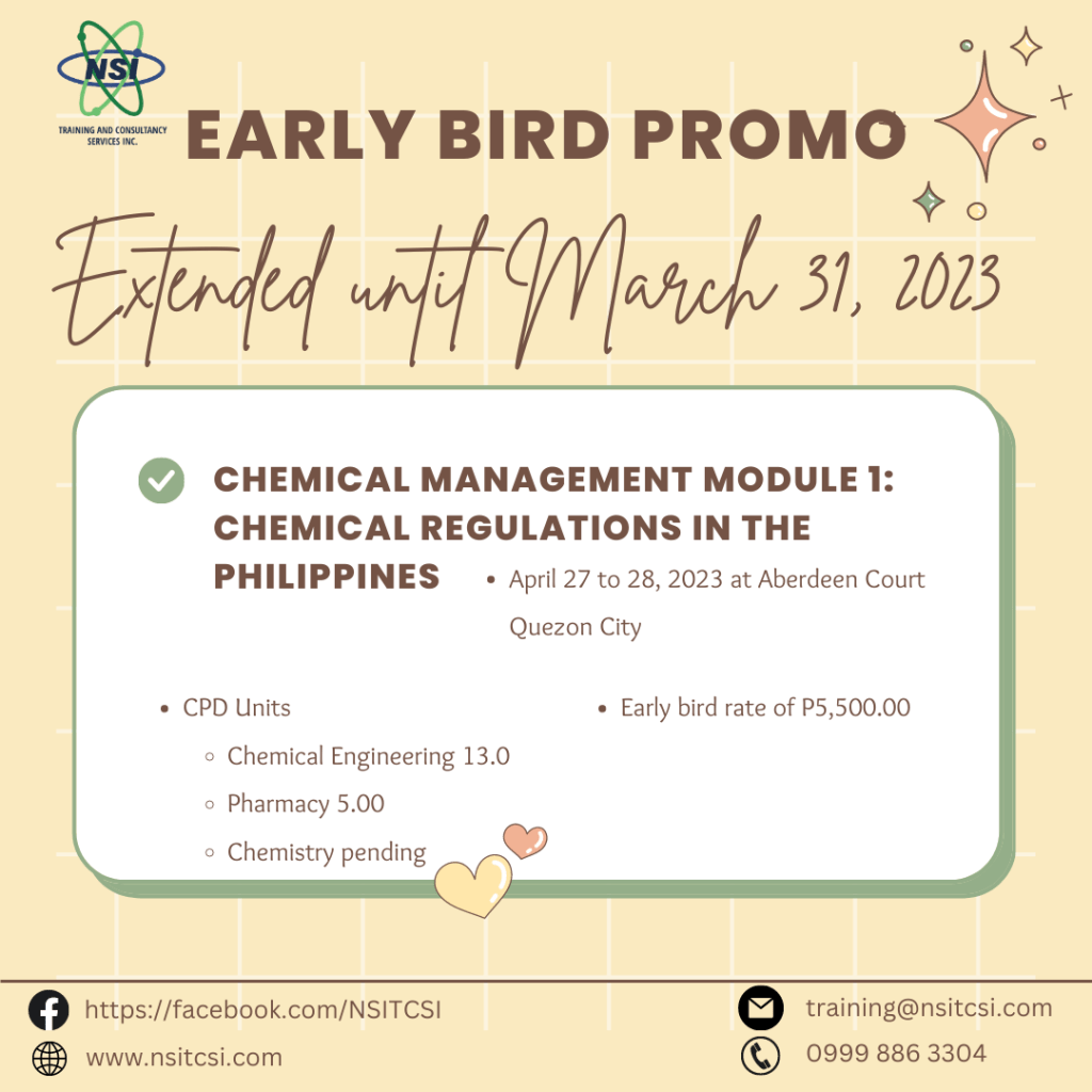 Joins us at the Chemical Management Module 1: Chemical Regulations in the Philippines. This will be held on April 27 to 28, 2023 from 8AM to 5PM at Aberdeen Court Quezon City. This promo is valid only today, February 25, 2023.