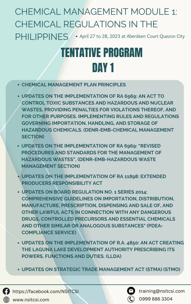 To all our participants for the Chemical Management Module 1: Chemical Regulations in the Philippines to be held on April 27-28, 2023 at Aberdeen Court Quezon City, here is the tentative program flow.