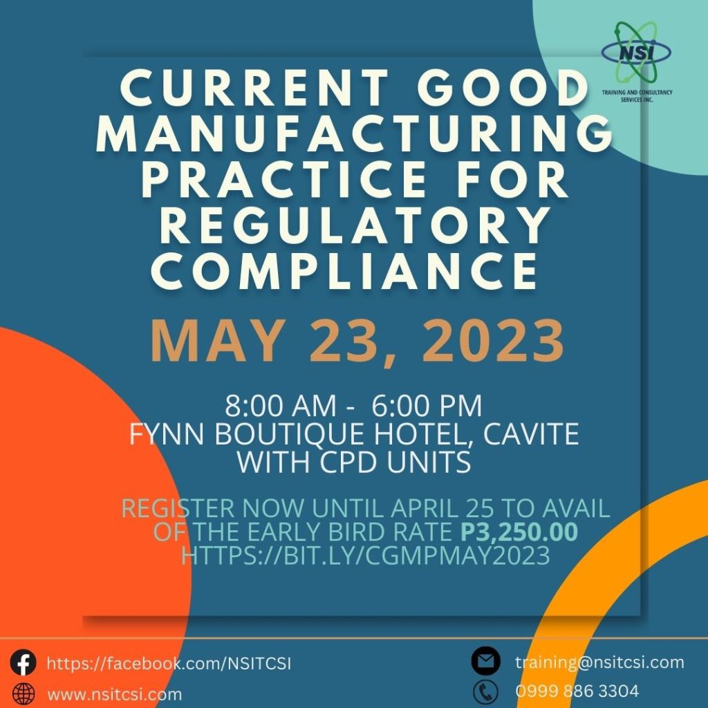 Our next training is Current Good Manufacturing Practice for Regulatory Compliance on May 23, 2023 at Fynn Boutique Hotel Cavite.