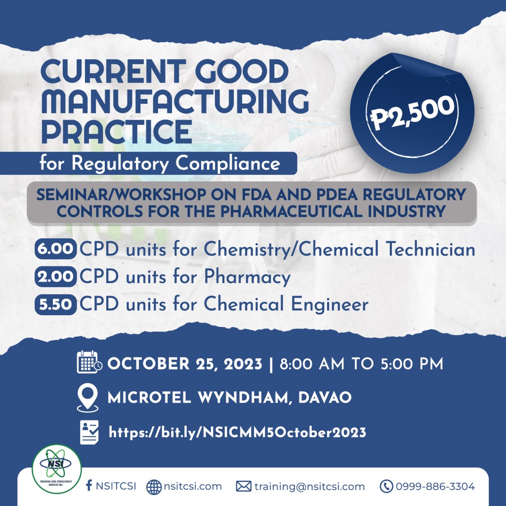 CHEMICAL MANAGEMENT MODULE 5: CURRENT GOOD MANUFACTURING PRACTICE FOR REGULATORY COMPLIANCE on October 25, 2023 at Microtel Wyndham DAVAO from 8:00 AM to 5:00 PM.