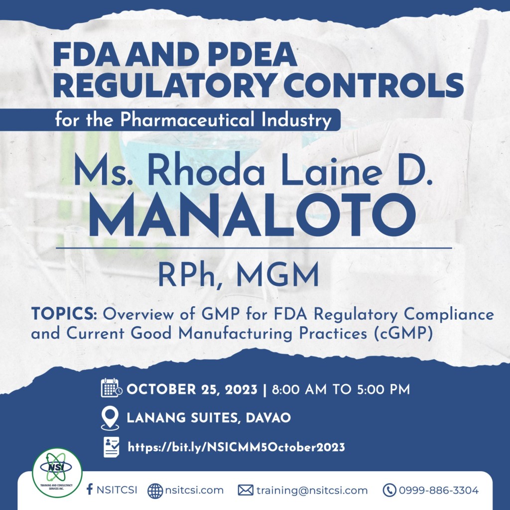 Join us on October 25, 2023 for the FDA AND PDEA REGULATORY CONTROLS FOR THE PHARMACEUTICAL INDUSTRY training at LANANG SUITES DAVAO CITY from 8:00 AM to 5:00 PM.