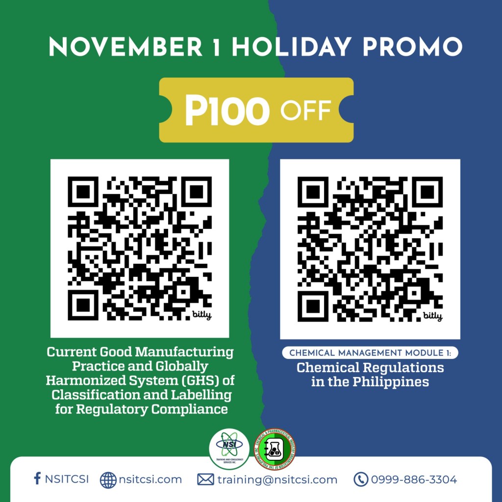 1. Chemical Management Module 1: Chemical Regulations in the Philippines – November 23 to 24, 2023 at Sequoia Hotel Quezon City (https://bit.ly/NSICMM1Nov2023)