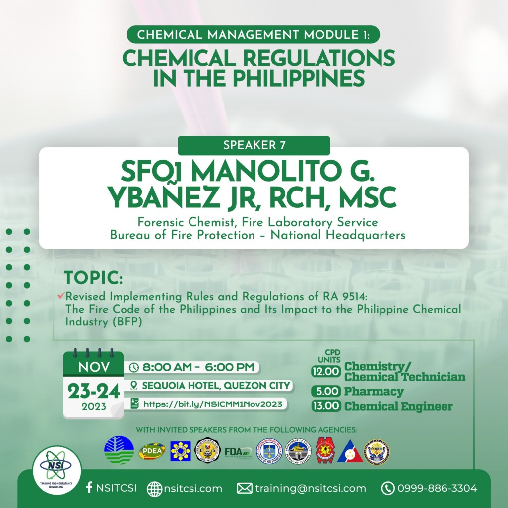 SFO1 Manolito G Ybañez Jr, RCh, MSc, Forensic Chemist, Fire Laboratory Service Bureau of Fire Protection – National Headquarters will talk about the following topic: