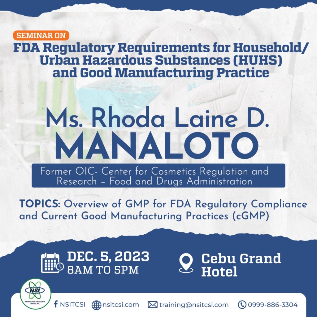 Join us on December 5, 2023 for the Seminar on FDA REGULATORY REQUIREMENTS FOR HOUSEHOLD/URBAN HAZARDOUS SUBSTANCES (HUHS) and GOOD MANUFACTURING PRACTICE at CEBU GRAND HOTEL from 8:00 AM to 5:00 PM.