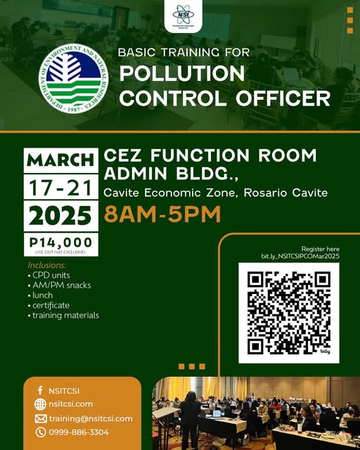 BASIC TRAINING ON POLLUTION CONTROL OFFICER (DENR) on March 17 to 21, 2025 (Monday to Friday) at CEZ Function Room, Admin. Bldg, Cavite Economic Zone, Rosario Cavite from 8:00 AM to 5:00 PM.