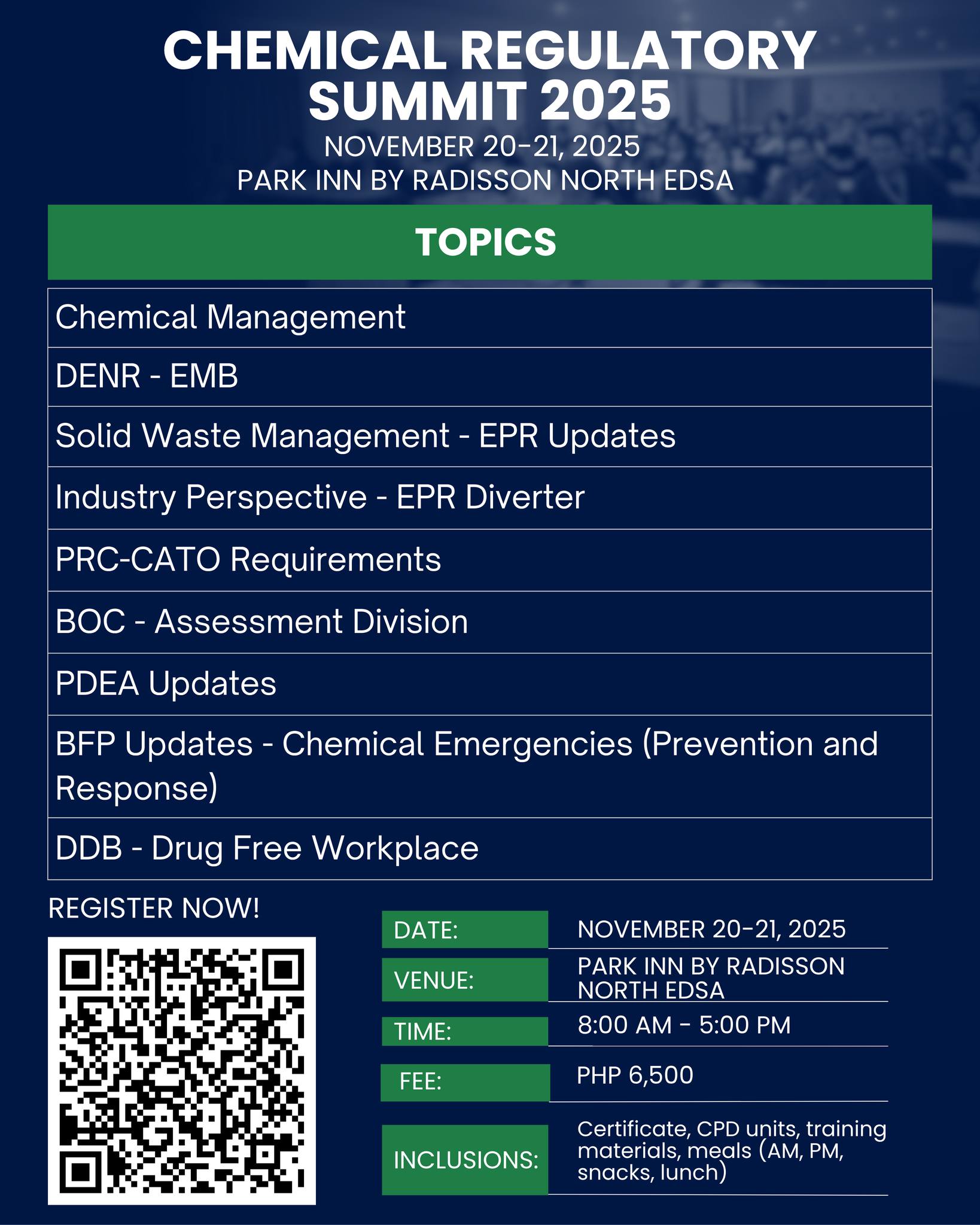 BASIC TRAINING ON POLLUTION CONTROL OFFICER (DENR) on March 17 to 21, 2025 (Monday to Friday) at CEZ Function Room, Admin. Bldg, Cavite Economic Zone, Rosario Cavite from 8:00 AM to 5:00 PM.Register here: https://bit.ly/NSITCSIPCOMar2025 The live-out rate is P14,000.00 inclusive of CPD units, training materials, certificate, food during the training (AM/PM snack and lunch).…